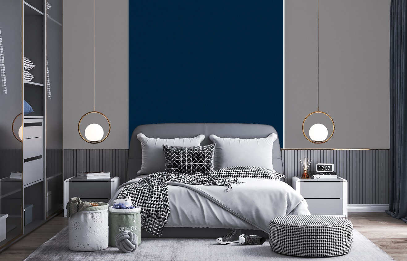 Indulge in serene bedroom goals with this stunning color combo, as you dream of cozy nights and sweet dreams in your luxurious blue sanctuary. Feel calm and relaxed in this beautiful blue bedroom adorned with a crisp white bed.